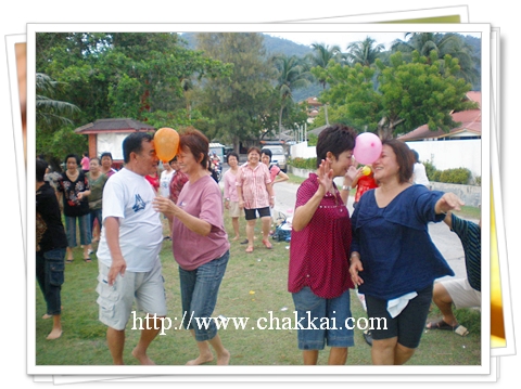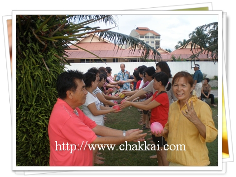 第三场是抛水球比赛,看似难度不高,不过要坚持到最后胜利却不易,妇女组财政陈玉梅来个胜利手势,希望能够争取胜利,呵呵!