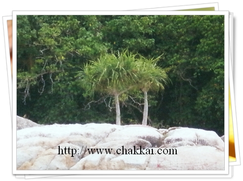 艇夫把快艇停在沿海的岩石旁,让我们观赏这两棵长在岩石上的树,他说这是“情人树”。