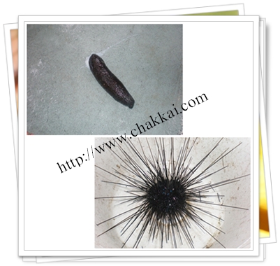 这是艇夫从海里捞上来给我们看的“海参”和“海胆”。